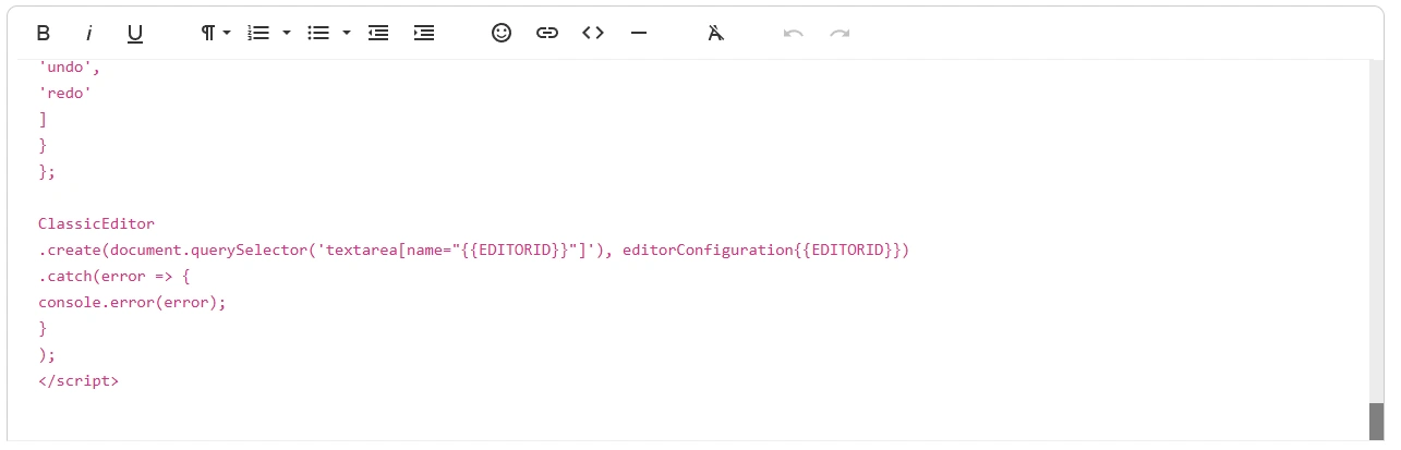 .create(document.querySelector('textarea[name="{{EDITORID}}"]'), editorConfiguration{{EDITORID}})