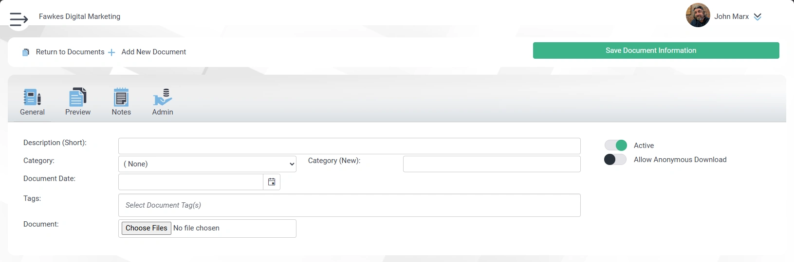 - Active: Whether the document is active or not. All documents uploaded this way are private and any document that is inactive is not available to be viewed.
